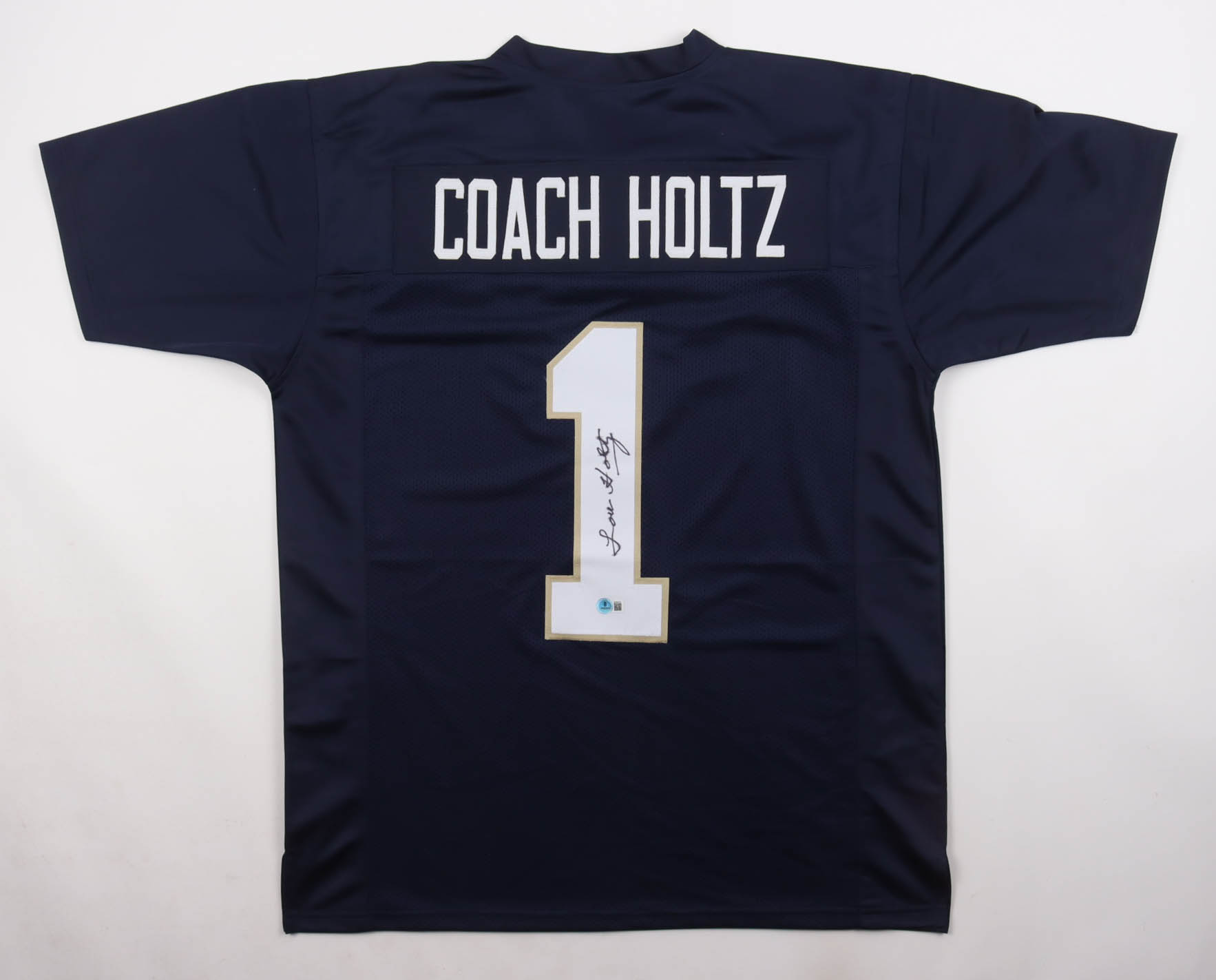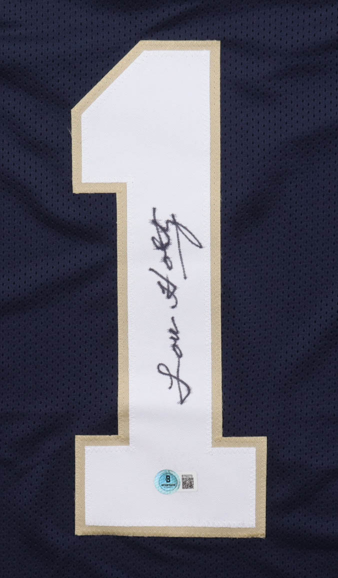 Custom jersey with everything sewn on, size XL. Hand-signed by Lou Holtz. Please note, the signature has bled and has staining above the hologram.