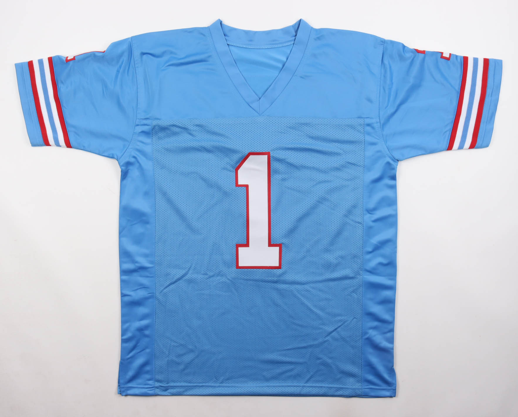 Custom jersey with everything sewn on, size XL. Hand-signed and inscribed by Warren Moon (HOF).