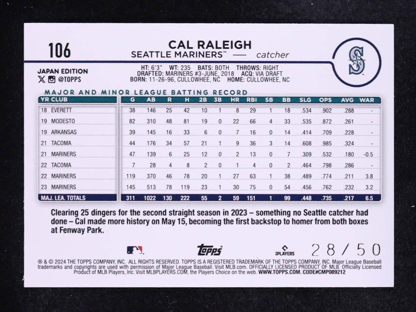Cal Raleigh 2024 Topps Japan Purple #106 #28/50