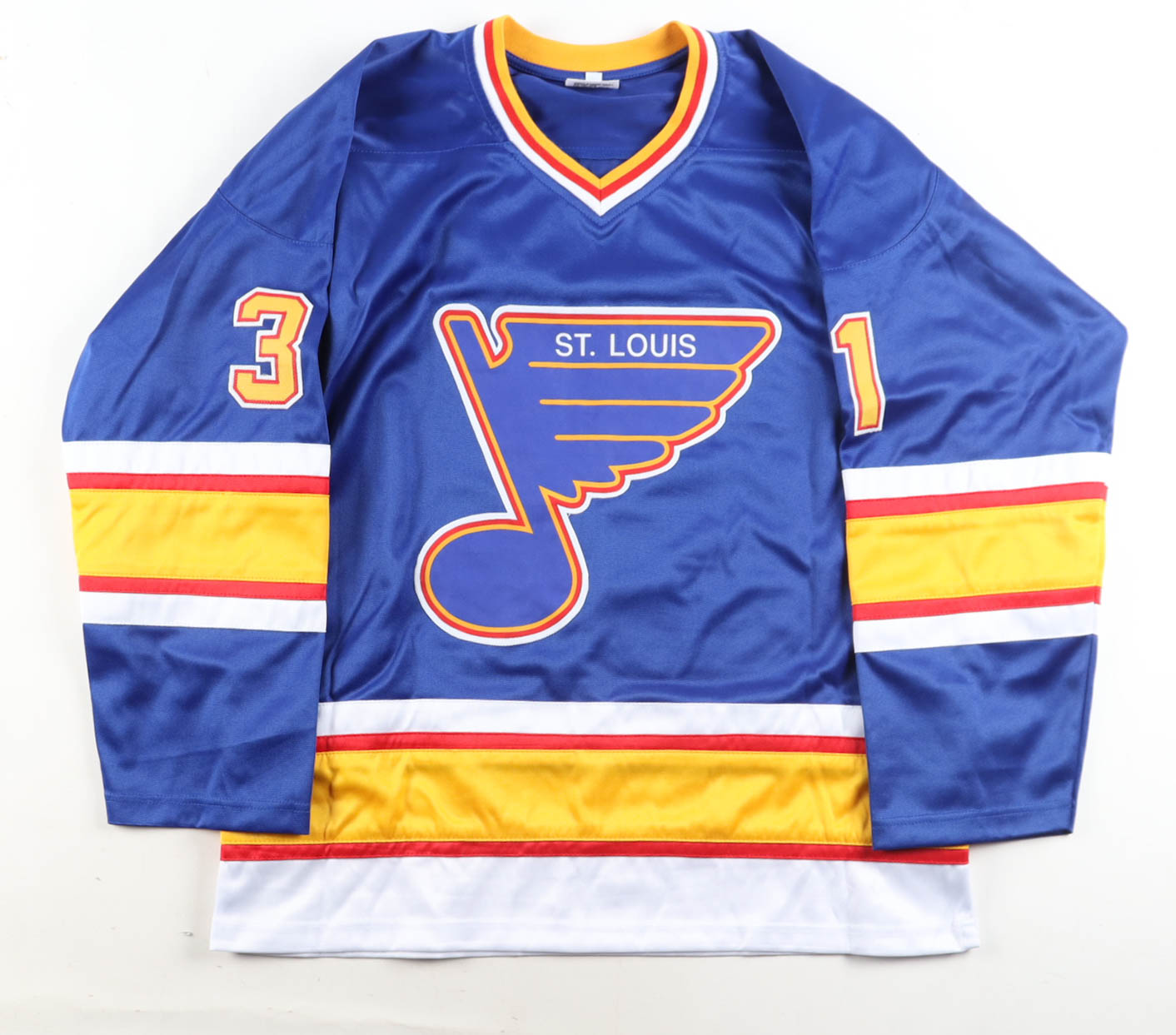 Custom jersey with everything sewn on, size XL. Has been hand-signed and inscribed by Grant Fuhr (HOF).