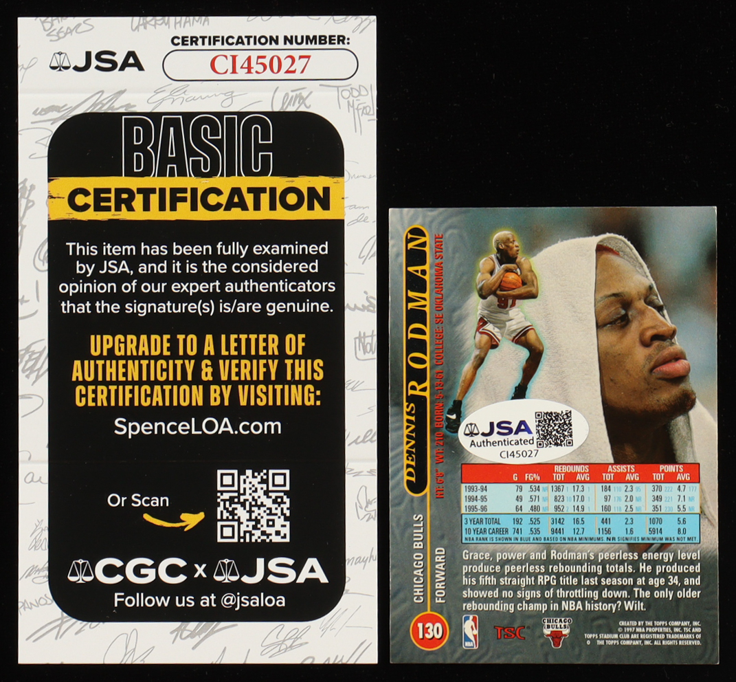 Dennis Rodman Signed 1996-97 Stadium Club #130 (JSA)