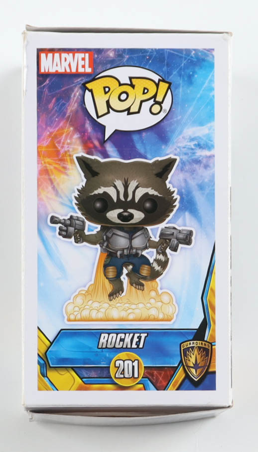 Vinyl figure measures approximately 4" tall and has been hand-signed on the packaging by Bradley Cooper (Rocket).