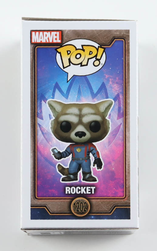 Vinyl figure measures approximately 4" tall and has been hand-signed on the packaging by Bradley Cooper (Rocket).