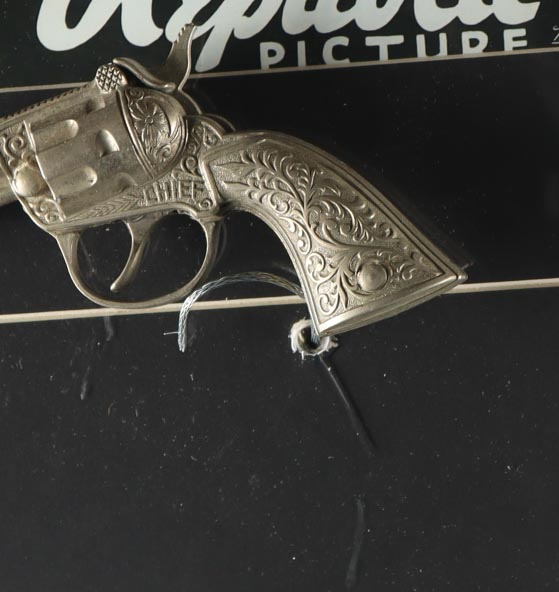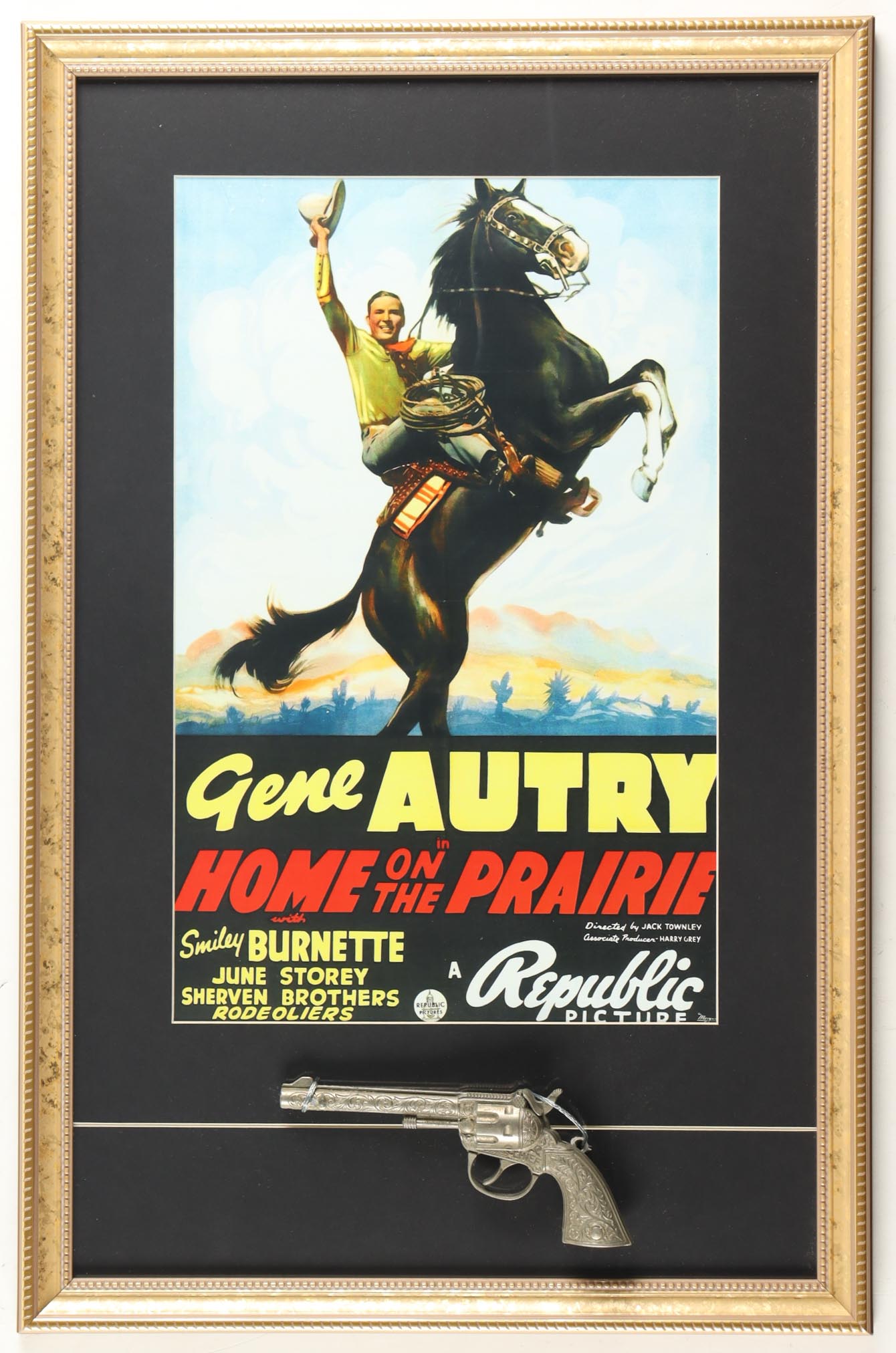 Custom frame measures approximately 17" x 26" in size and features a movie poster print of Gene Autry (D. 1998). Display also includes a replica prop pistol. Please note, the display is unsigned and the prop pistol is not fully attached to the display.