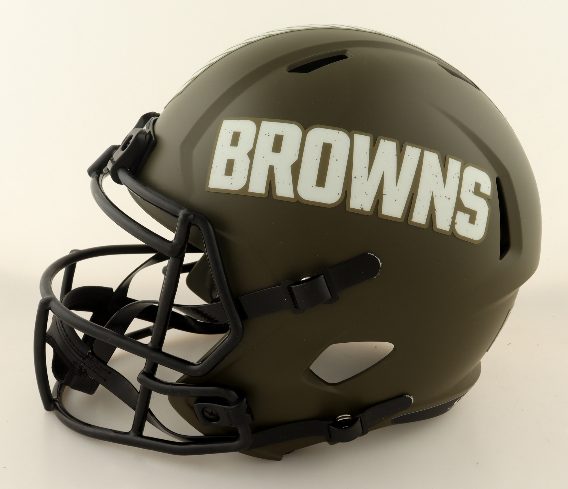 Riddell Cleveland Browns full-size Salute to Service Alternate replica speed helmet. Hand-signed and inscribed by Joe Thomas (HOF).