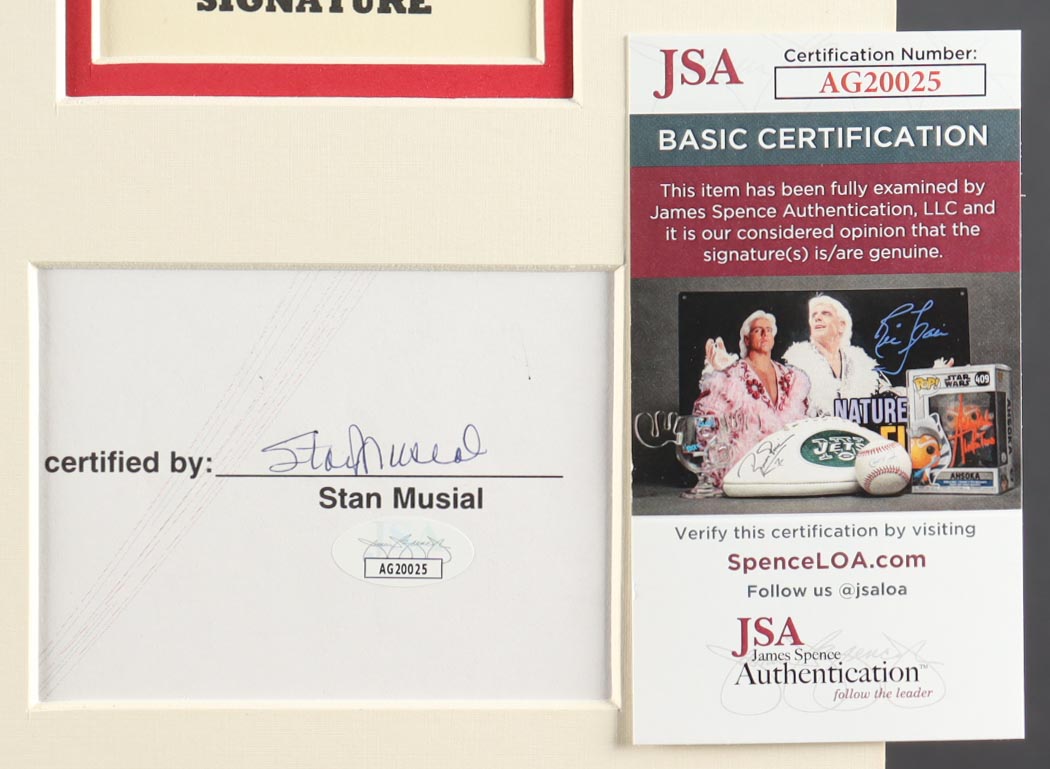 Custom photo display measures approximately 14" x 18" in size and features a cut that has been hand-signed by Stan Musial (D. 2013, St. Louis Cardinals, HOF).