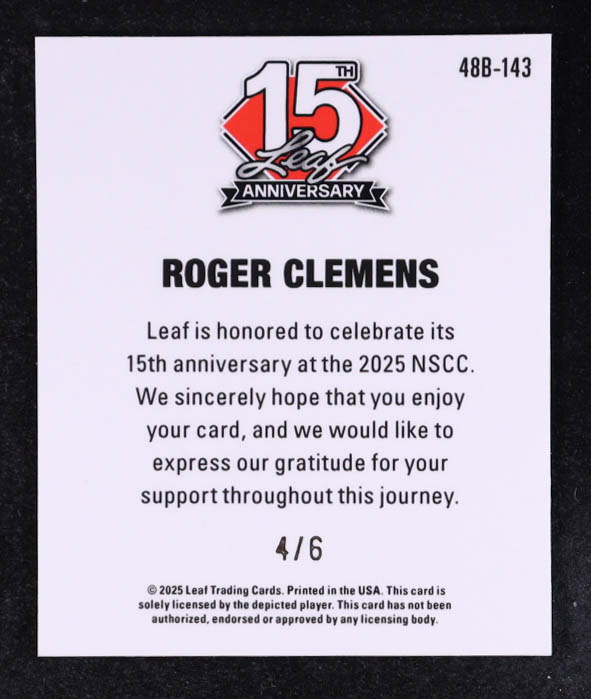Roger Clemens 2025 Leaf 15th National NSCC Anniversary '48 Green Sparkle #48B143 #4/6