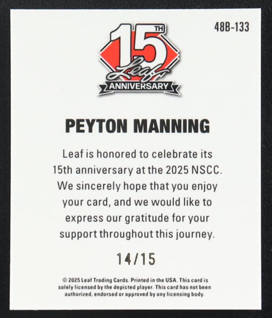 Peyton Manning 2025 Leaf 15th Anniversary '48 Leaf Silver Sparkle #48B133 #14/15