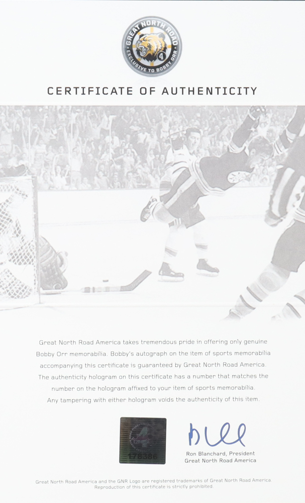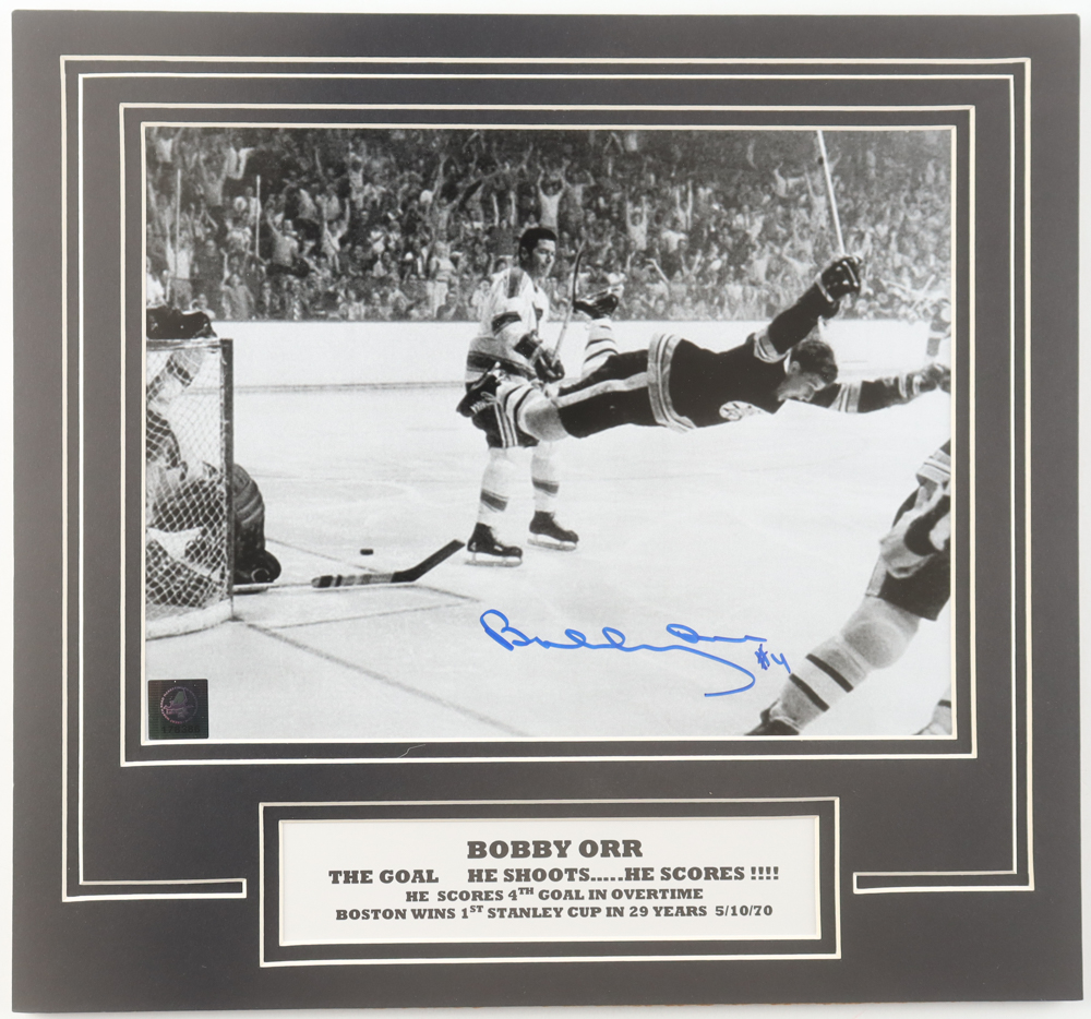 Matting measures 13" x 14" in size. Features a photo that has been hand-signed by Bobby Orr (Boston Bruins, HOF).