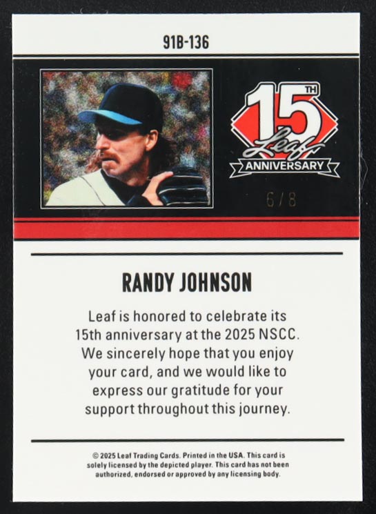Randy Johnson 2025 Leaf 15th Anniversary '91 Leaf Pink Laser #90B136 #6/8