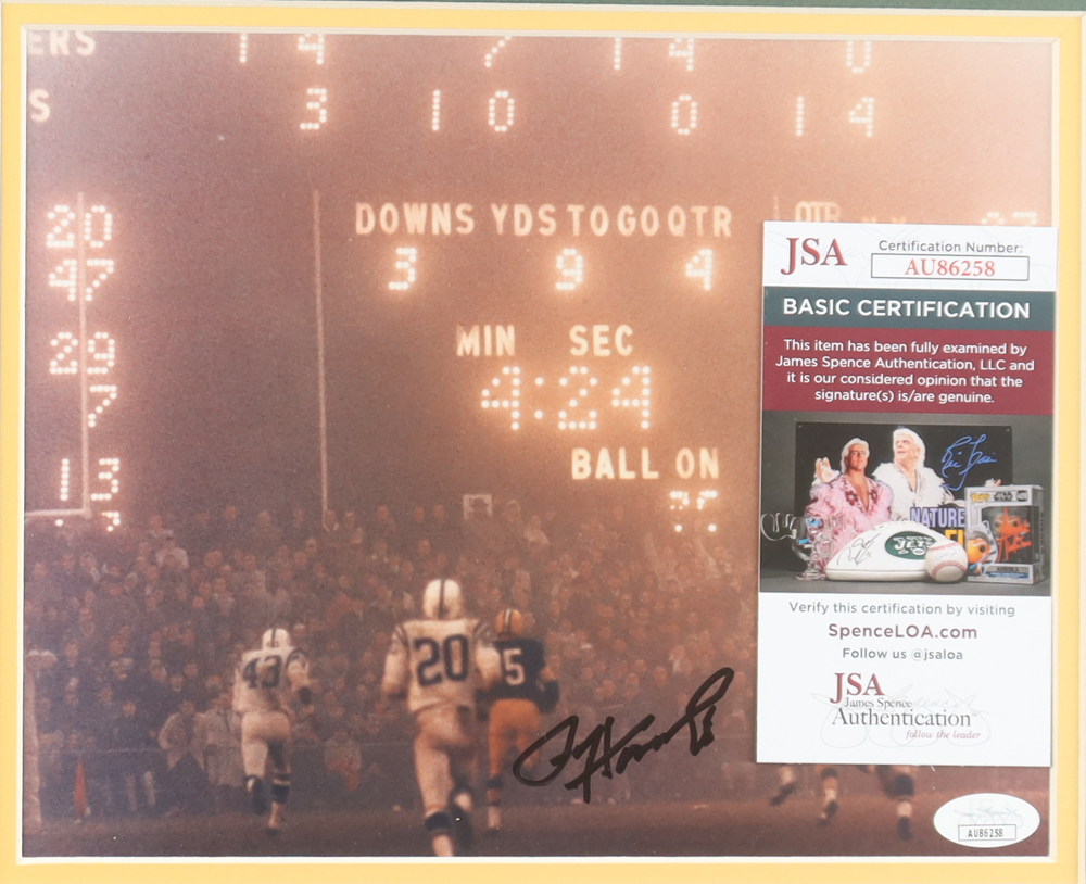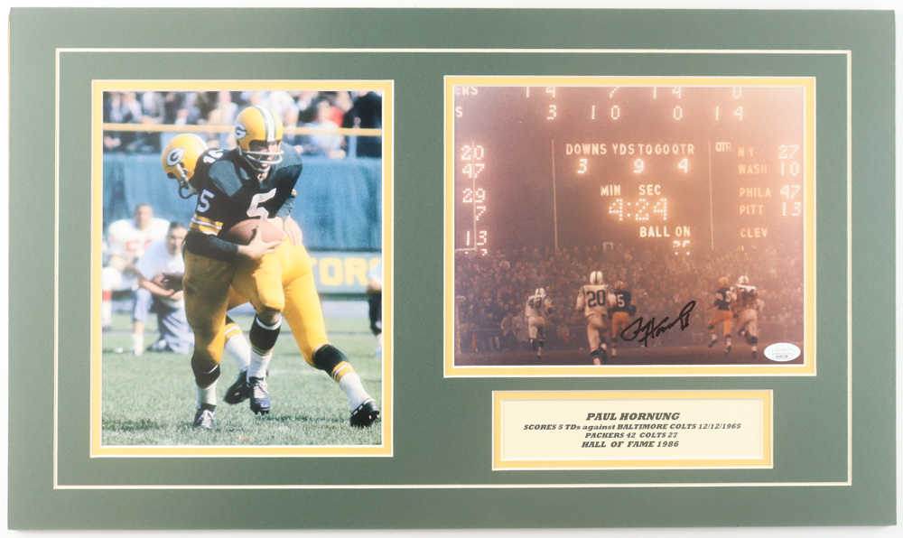 Matting measures 14" x 24" in size. Features a photo that has been hand-signed by Paul Hornung (D. 2020, Green Bay Packers, HOF).