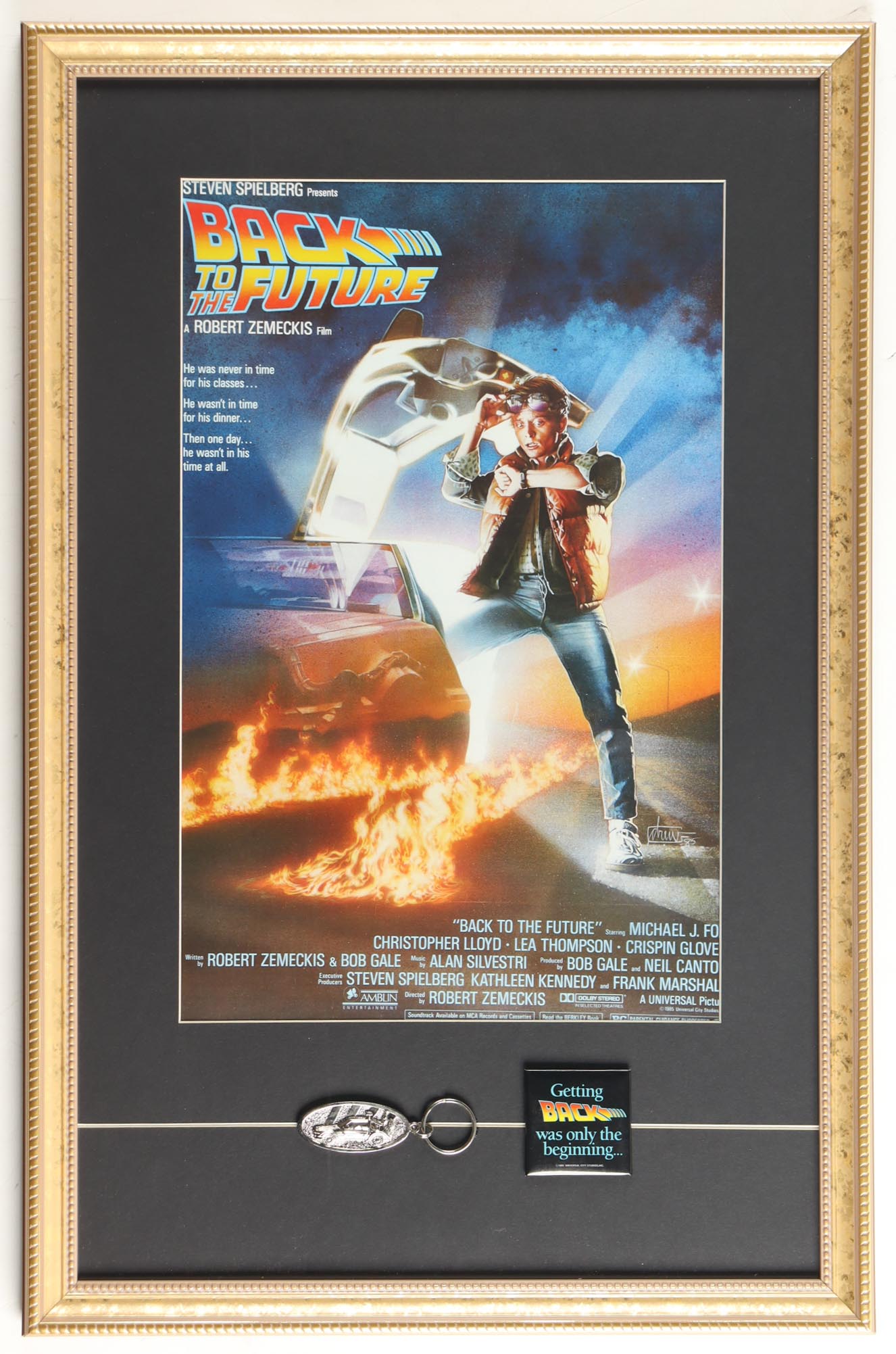Custom framed display measures approximately 17" x 27" in size and features a photo of the "Back to the Future". The display also includes a keychain and a lapel pin. Please note that the item is unsigned.
