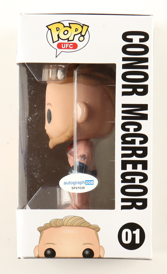 Funko Pop! vinyl figure measures approximately 4" tall and has been hand-signed on the packaging by Conor McGregor. Please note, the window has been swapped and there is damage to the packaging, see photos for more details.