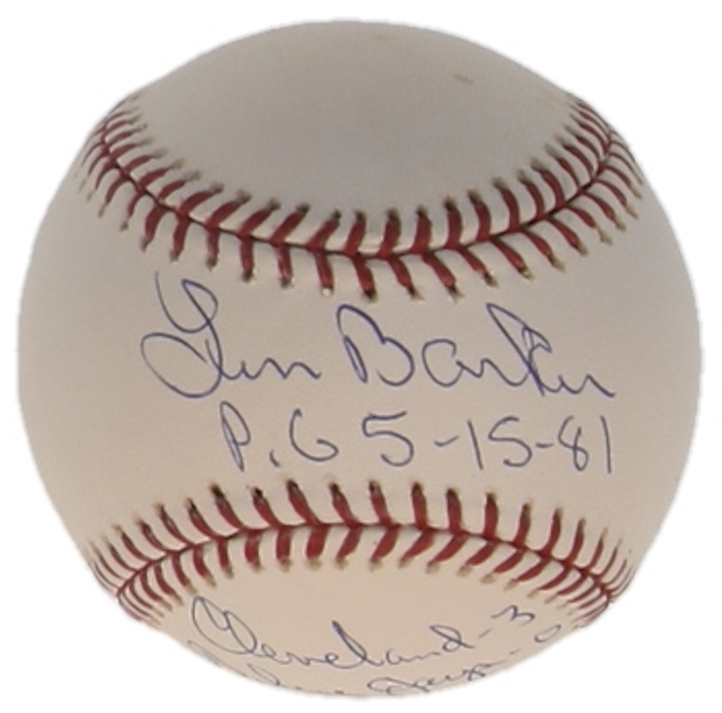 Len Barker Signed OML Baseball Inscribed "P.G. 5-15-81" & "Cleveland - 3 Blue Jays - 0" (PSA)
