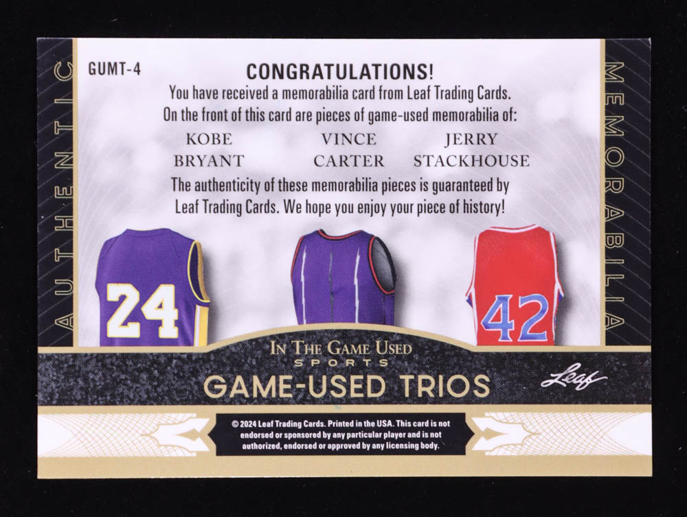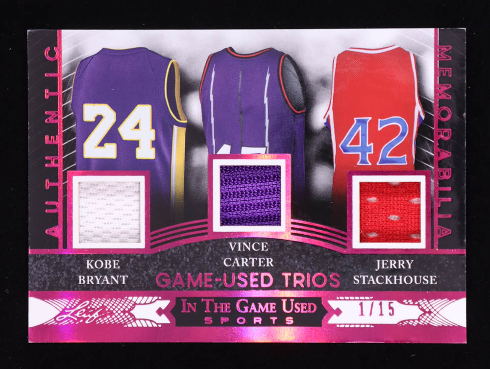 Kobe Bryant / Vince Carter / Jerry Stackhouse 2024 Leaf ITG Used Sports Game Used Trios Spectrum Pink #GUMT4 #01/15
