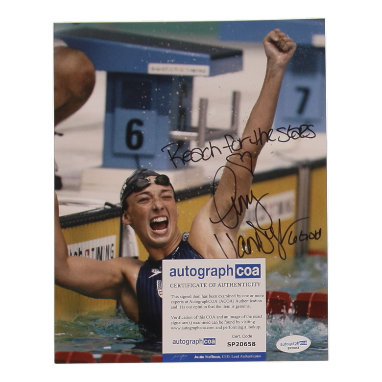 Photo measures 8" x 10" in size and has been hand-signed and inscribed by Amy Van Dyken (Team USA).