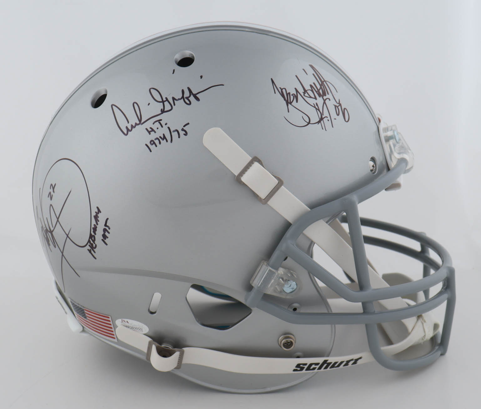 Archie Griffin, Troy Smith & Eddie George Signed Ohio State Buckeyes Full-Size Helmet Inscribed "H.T. 1974/75" & "HT 06" & "Heisman 1995" (JSA)