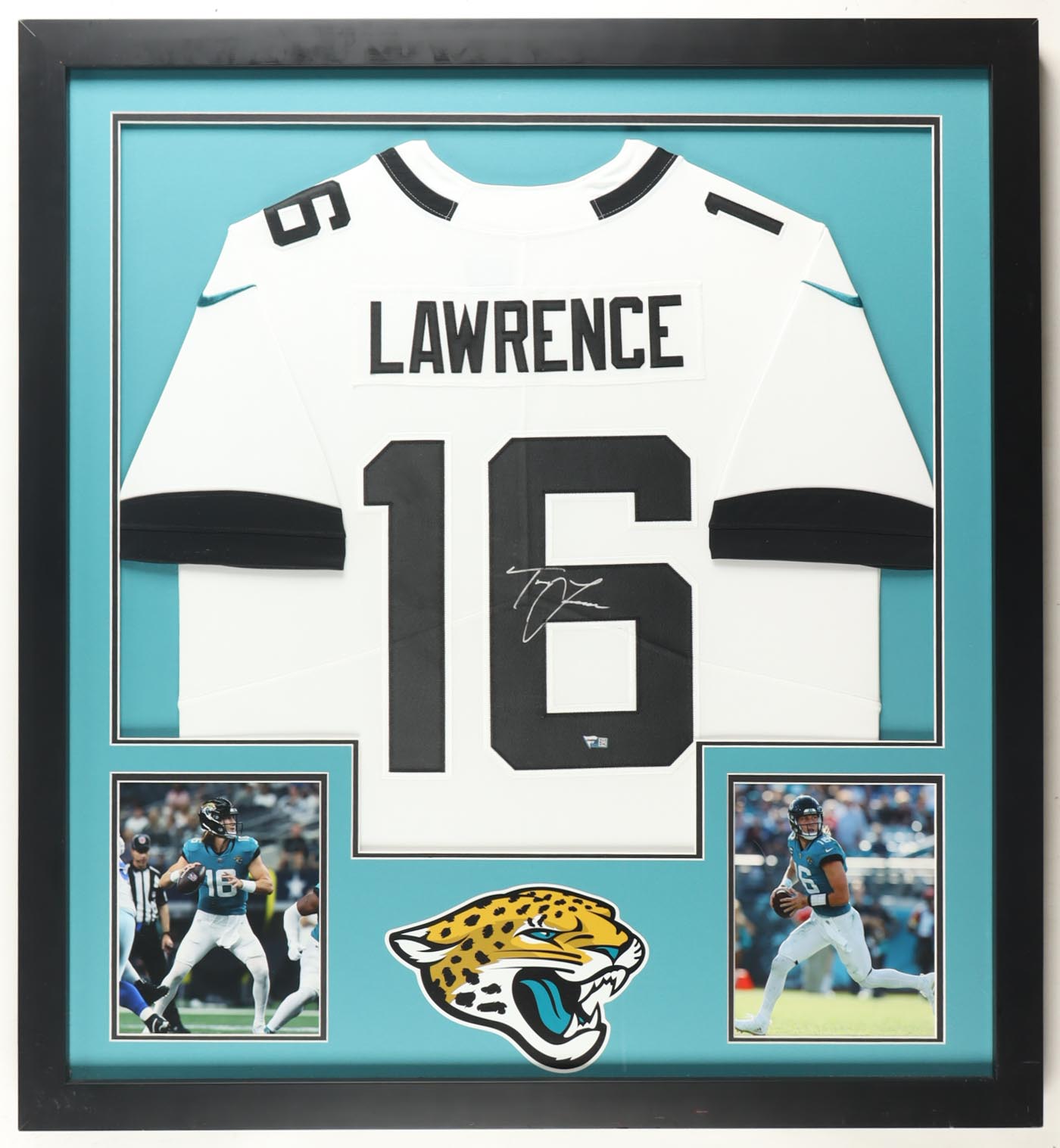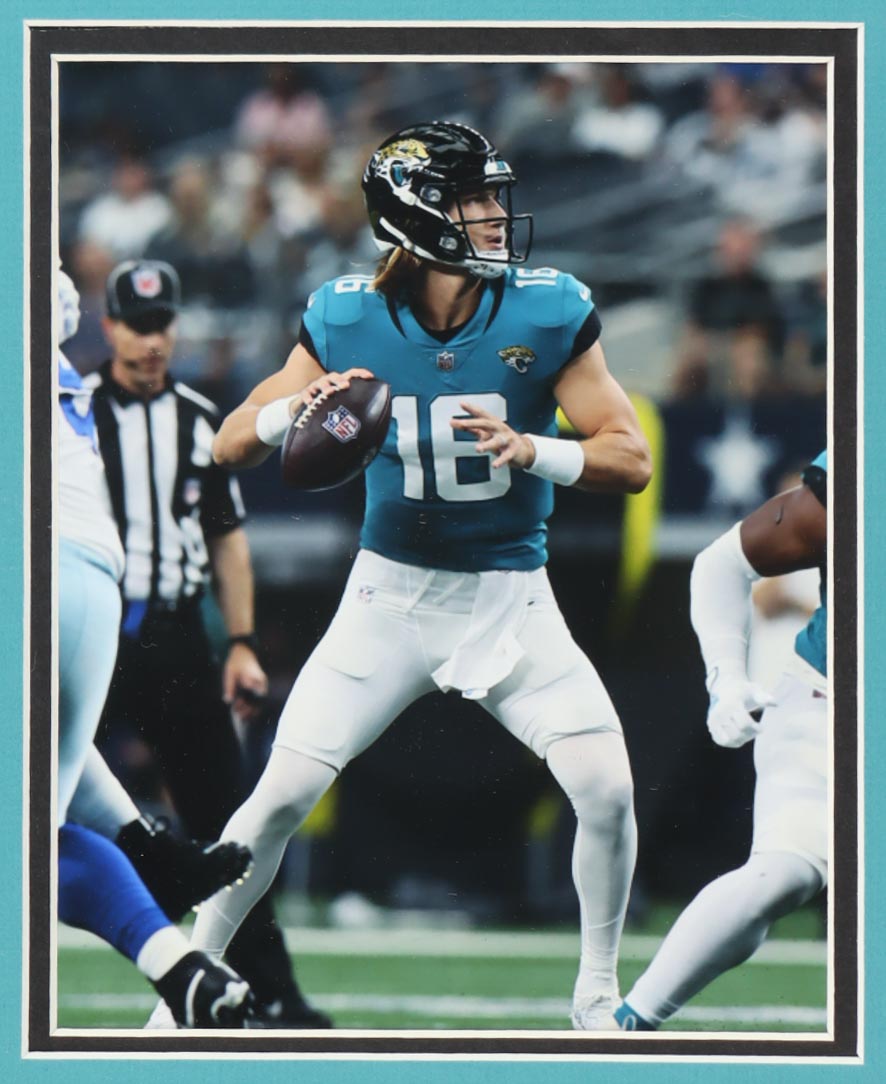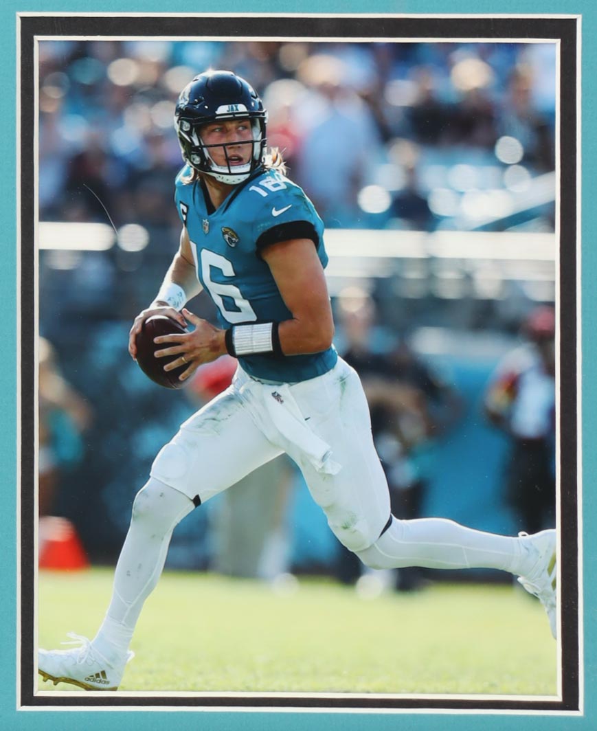 Custom frame measures approximately 35" x 38" in size and features a jersey that has been hand-signed by Trevor Lawrence. Display also includes (2) 8" x 10" photos.