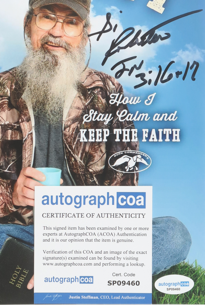 Photo measures 8" x 10" in size and has been hand-signed and inscribed by Si Robertson.