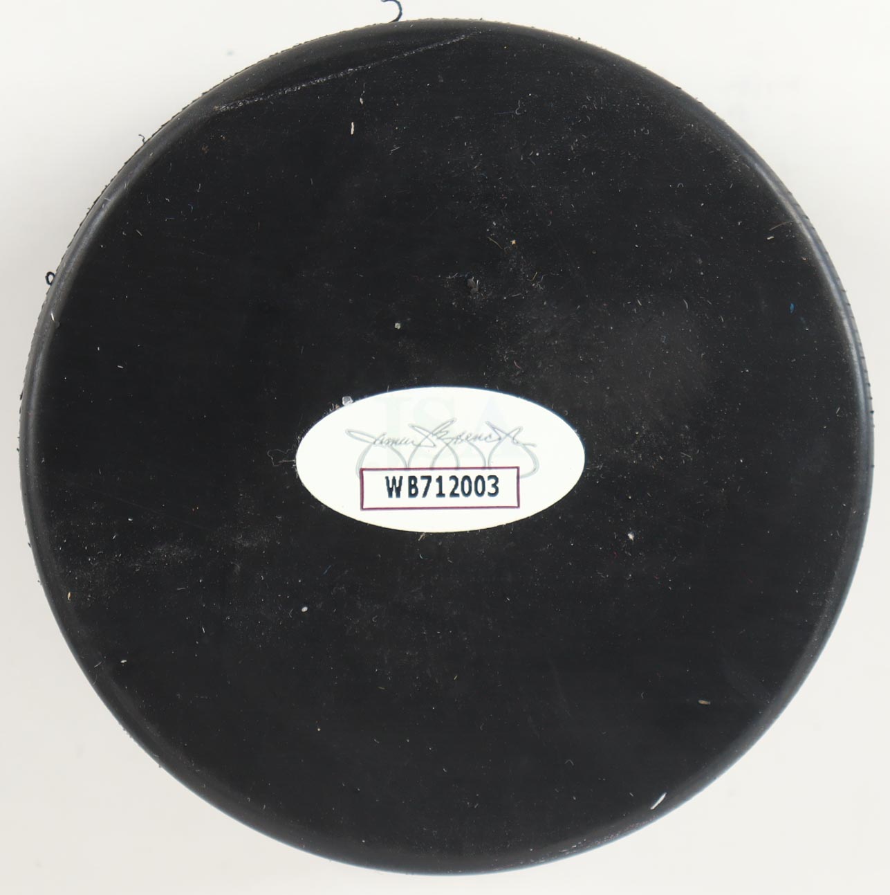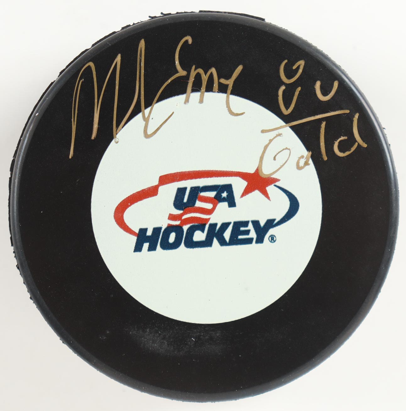 Team USA logo hockey puck. Hand-signed and inscribed by Mike Eruzione.