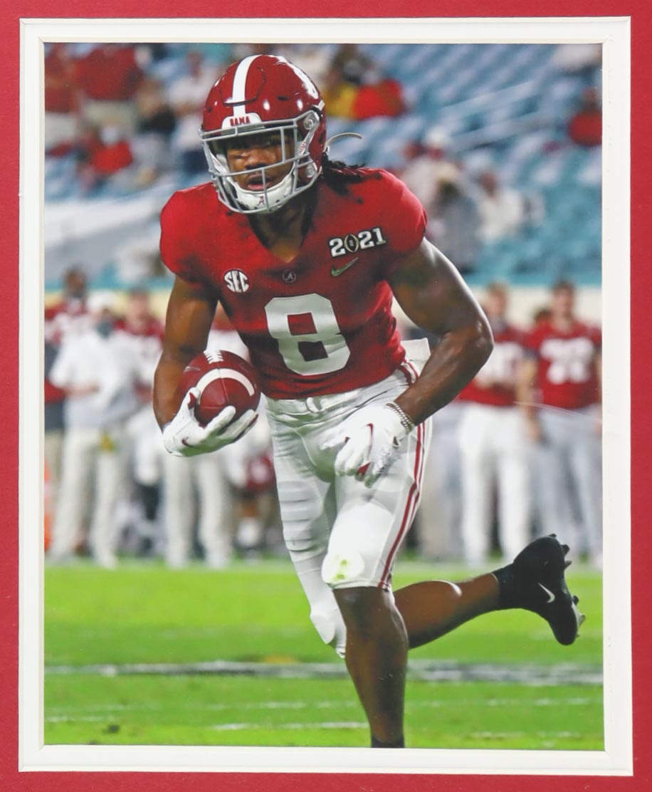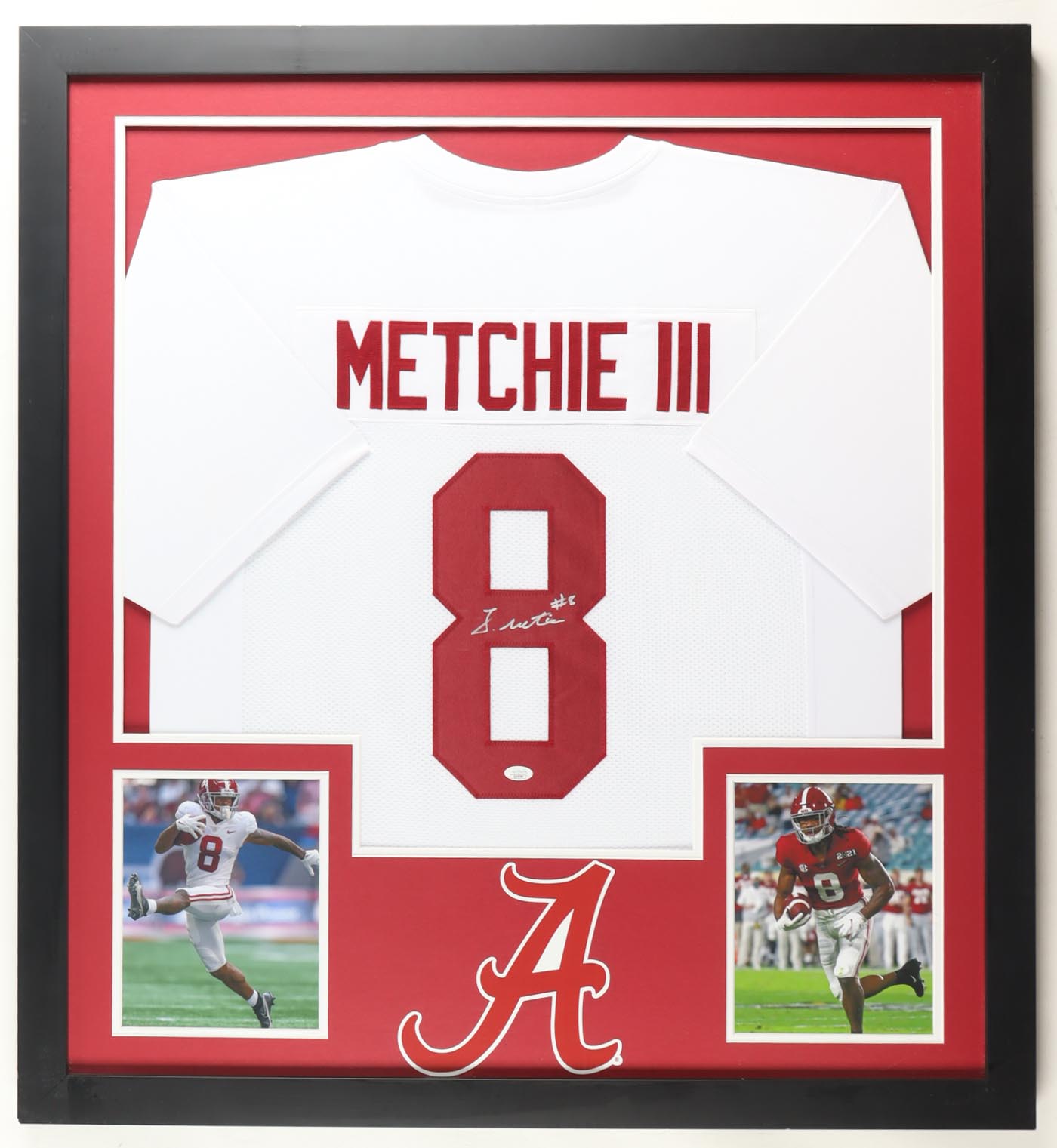 Custom frame measures approximately 35" x 38" in size and features a jersey that has been hand-signed by John Metchie III. Display also includes (2) 8" x 10" photos.