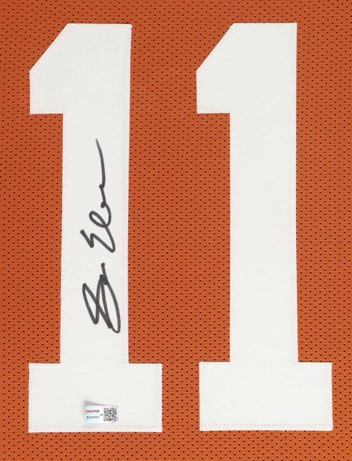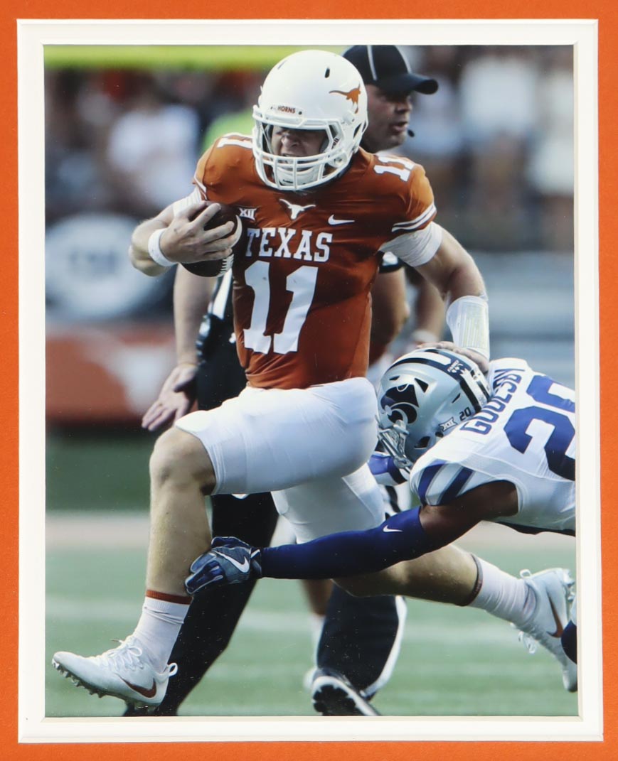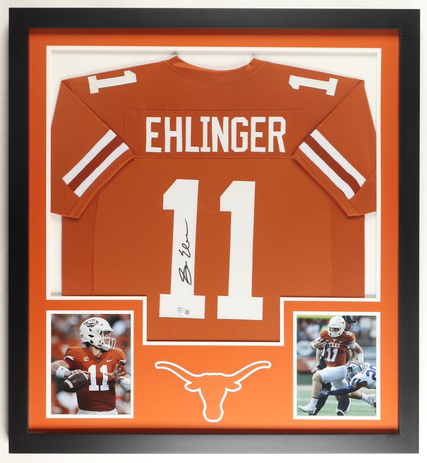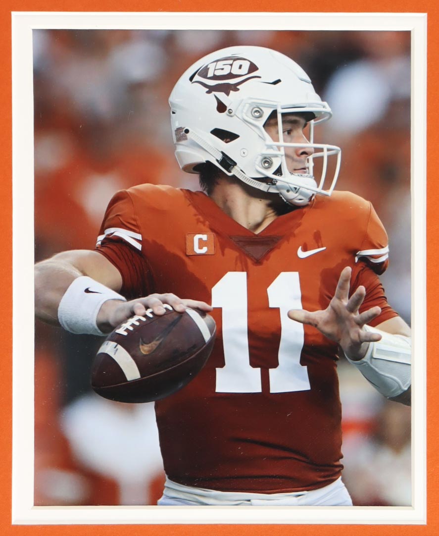 Custom frame measures approximately 35" x 38" in size and features a jersey that has been hand-signed by Sam Ehlinger. Display also includes (2) 8" x 10" photos.