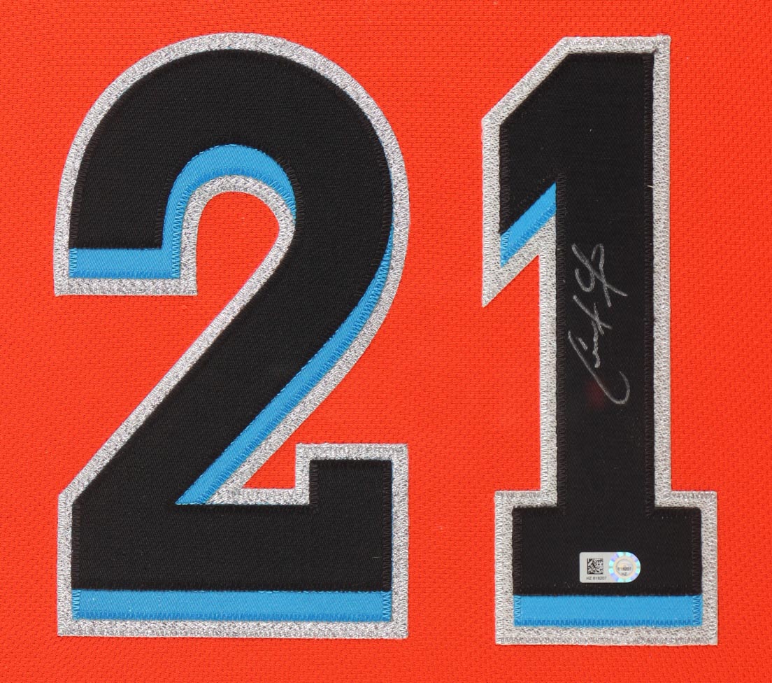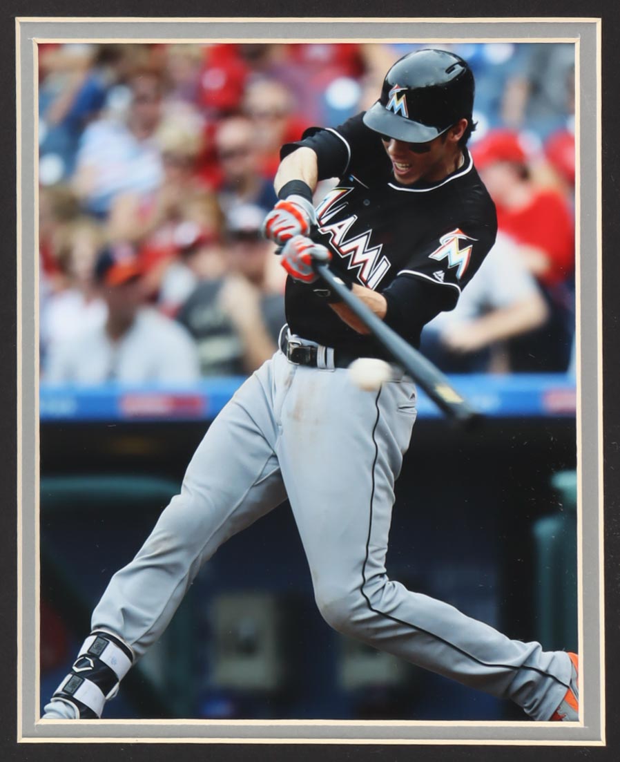 Custom frame measures approximately 35" x 38" in size and features a jersey that has been hand-signed by Christian Yelich. Display also includes (2) 8" x 10" photos.