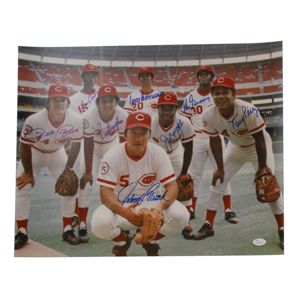 Photo measures 16" x 20" in size. Hand-signed by (8) components of the Cincinnati Reds's Big Red Machine including Pete Rose, George Foster, Cesar Geronimo, Dave Concepcion, Ken Griffey Sr., Johnny Bench, Tony Perez and Joe Morgan.