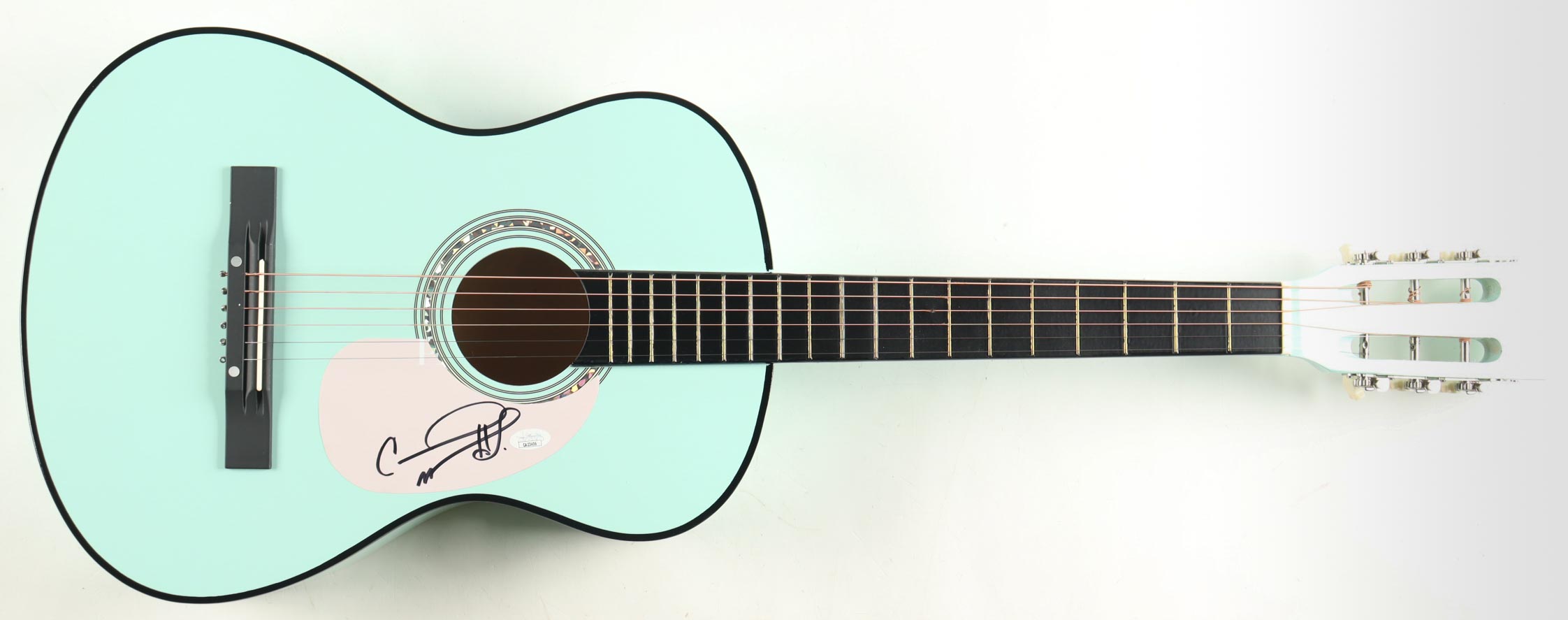 Acoustic guitar measures approximately 38" in length and has been hand-signed by Carrie Underwood on a cut that has been repurposed as the pickguard.