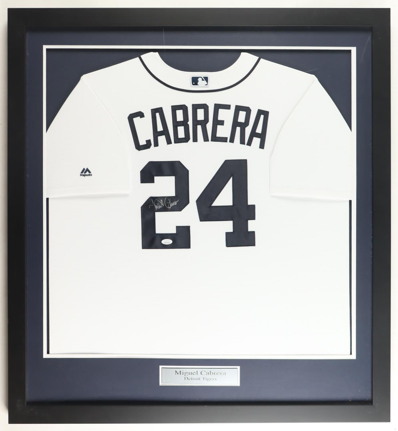 Custom frame measures approximately 35" x 38" in size and features a jersey that has been hand-signed by Miguel Cabrera.