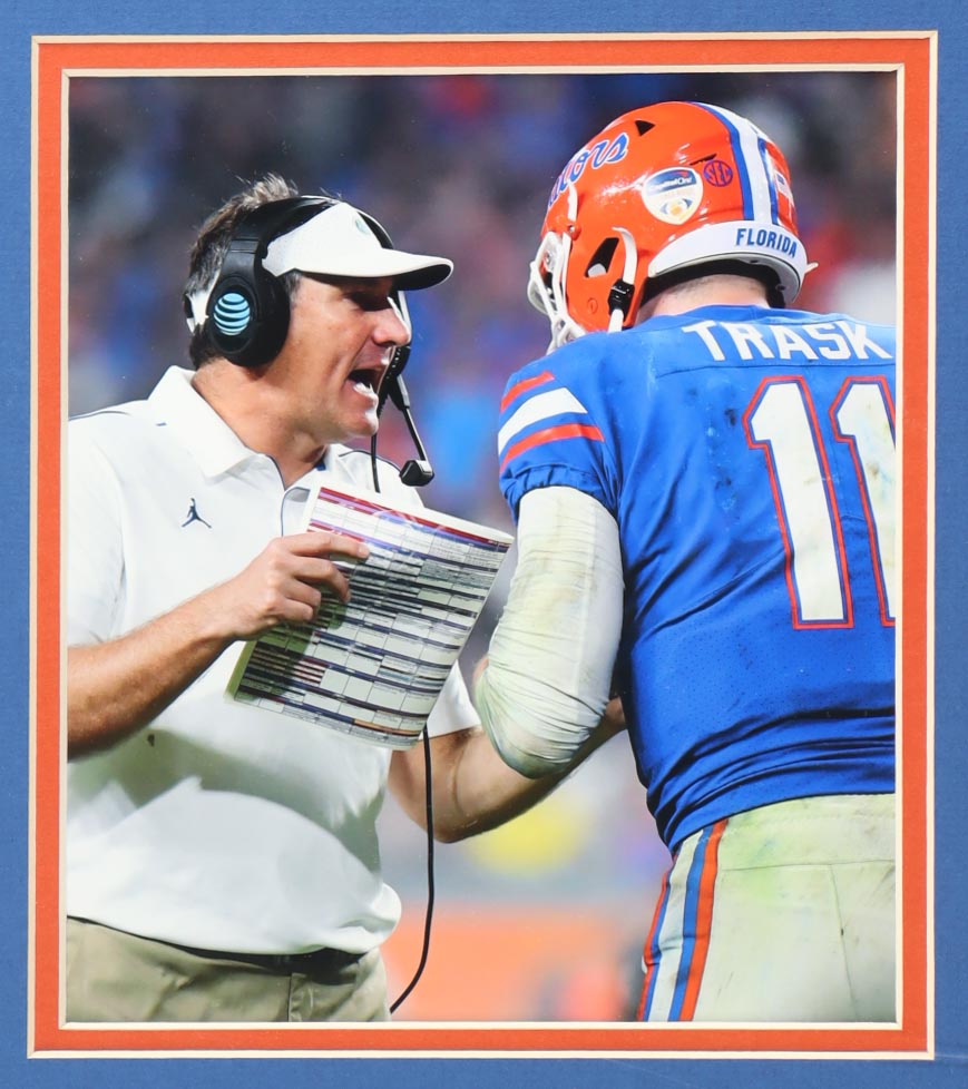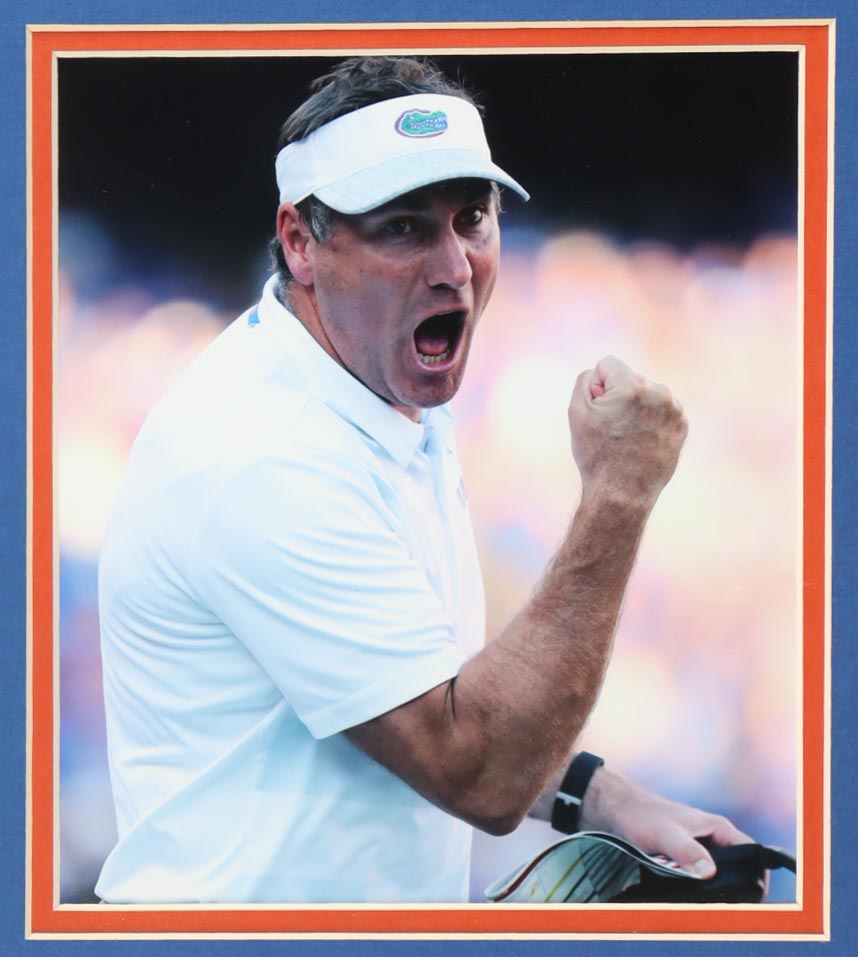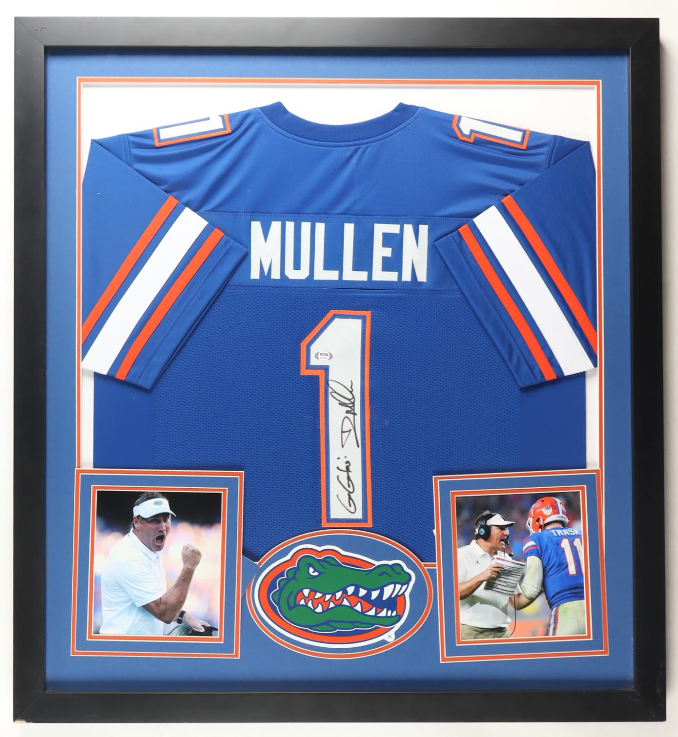 Custom frame measures approximately 35" x 38" in size and features a jersey that has been hand-signed and inscribed by Dan Mullen. Display also includes (2) 8" x 10" photos.