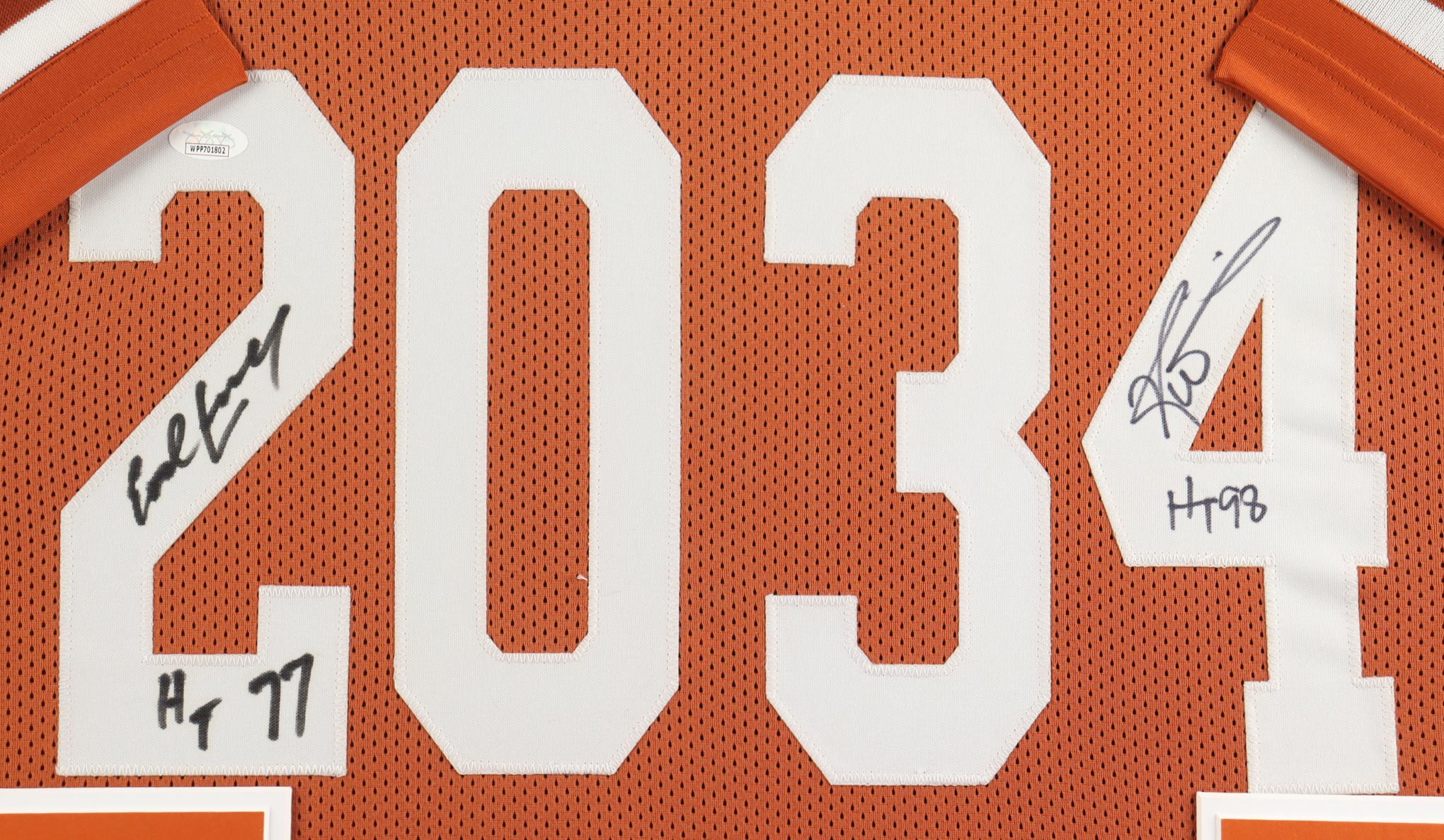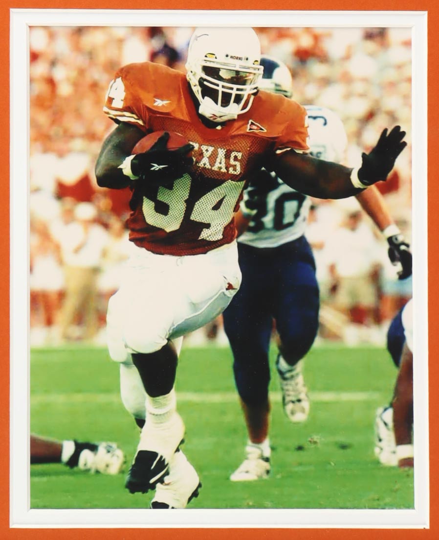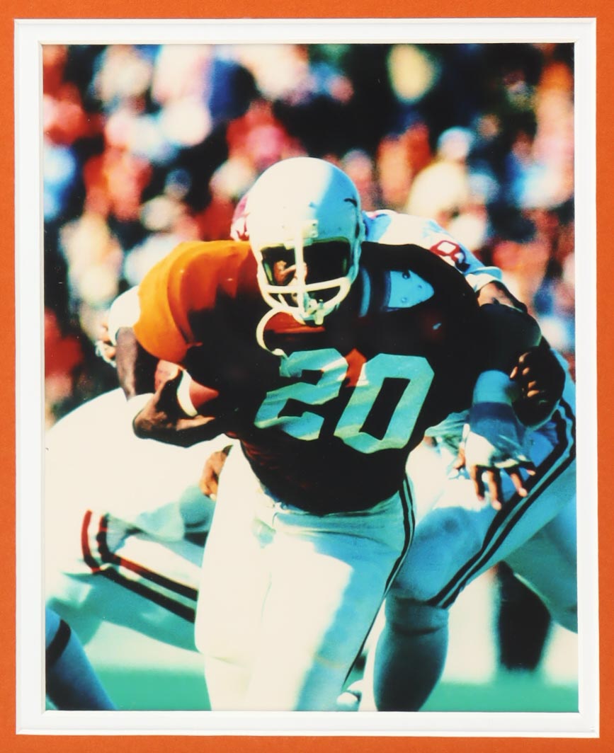 Custom frame measures approximately 35" x 38" in size and features a jersey that has been hand-signed and inscribed by Earl Campbell (HOF) and Ricky Williams. Display also includes (2) 8" x 10" photos.