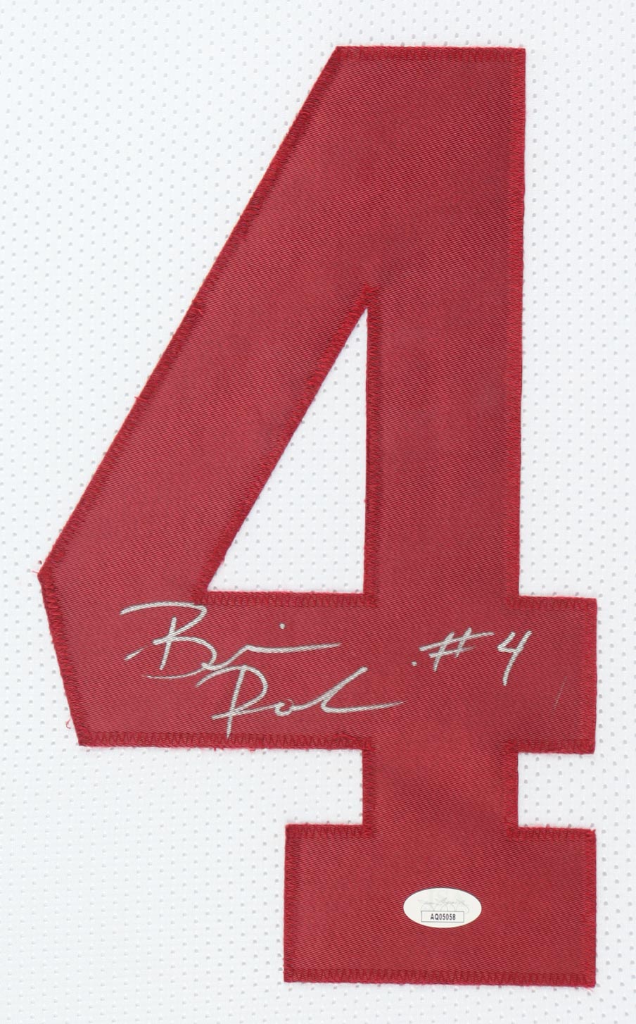 Custom frame measures approximately 35" x 38" in size and features a jersey that has been hand-signed by Brian Robinson Jr. Display also includes (2) 8" x 10" photos.