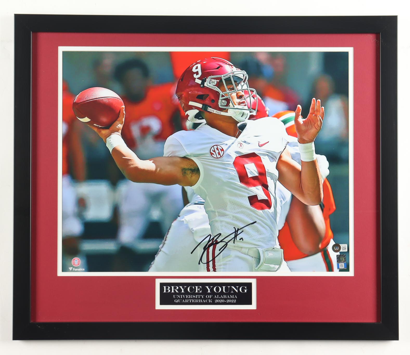 Custom frame measures approximately 22" x 26" in size and has been hand-signed by Bryce Young. Please see photos for details regarding the item.