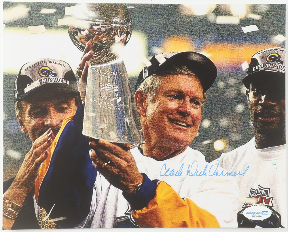 Photo measures 8" x 10" in size and has been hand-signed and inscribed by Dick Vermeil (St. Louis Rams, HOF).