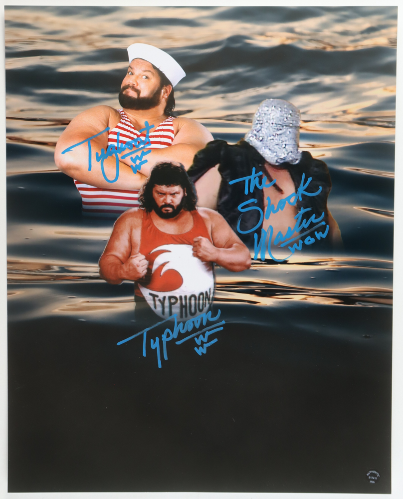 Photo measures 16" x 20" in size. Hand-signed and inscribed by Fred Ottman (HOF) as his "Tugboat," "The Shockmaster" and "Typhoon" in-ring personas.