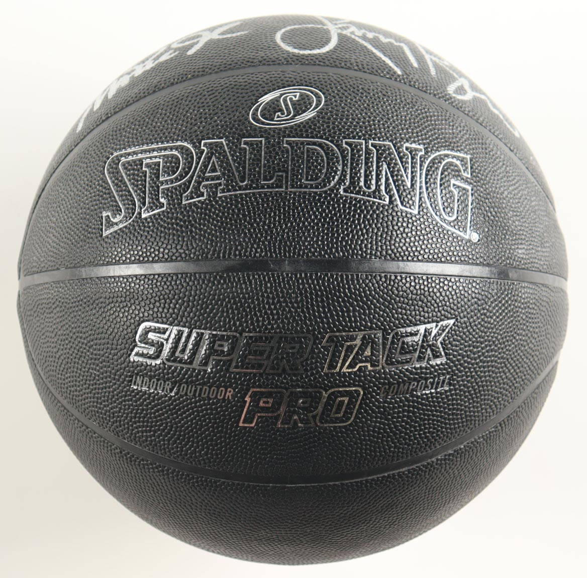 Spalding Black Super Tack NBA Basketball. Hand-signed by Magic Johnson (Los Angeles Lakers, HOF) and Larry Bird (Boston Celtics, HOF).