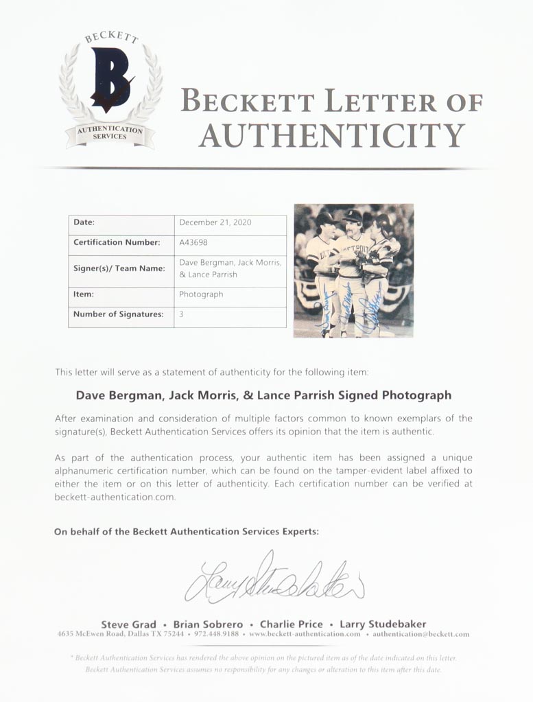 Custom frame measures approximately 14" x 17" in size and has been hand-signed and inscribed by Dave Bergman (D. 2015), Jack Morris (HOF) and Lance Parish. Please see photos for details regarding the item.