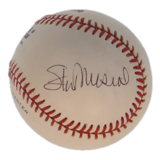 Rawlings Official National League Baseball. Hand-signed by Stan Musial (D. 2013, St. Louis Cardinals, HOF). Please note, the baseball is naturally toning and stained.