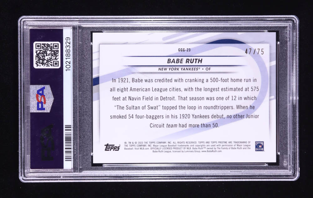 Babe Ruth 2023 Topps Pristine Going, Going, Gone Blue Refractors #GGG23 #47/75 (PSA 10)