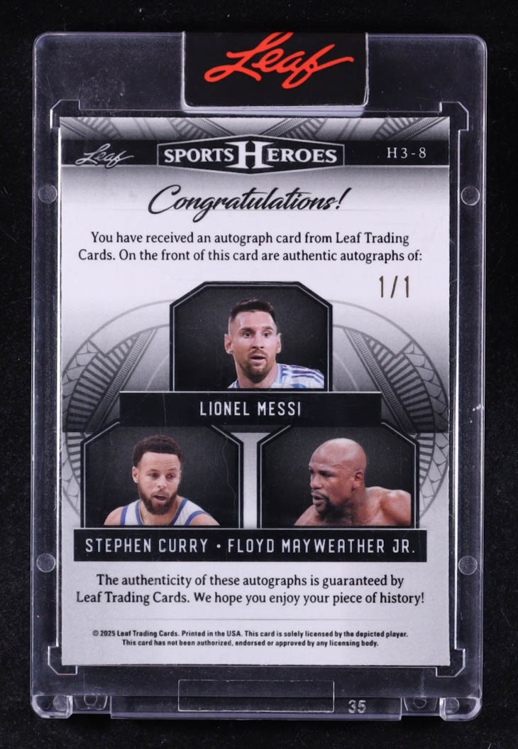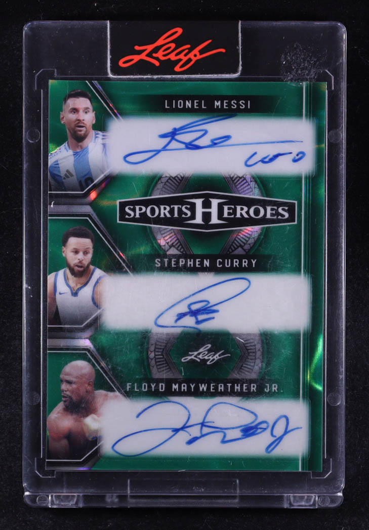 Lionel Messi / Stephen Curry / Floyd Mayweather Jr. 2025 Leaf Sports Heroes Autographs Crystal Green #H38 #1/1
