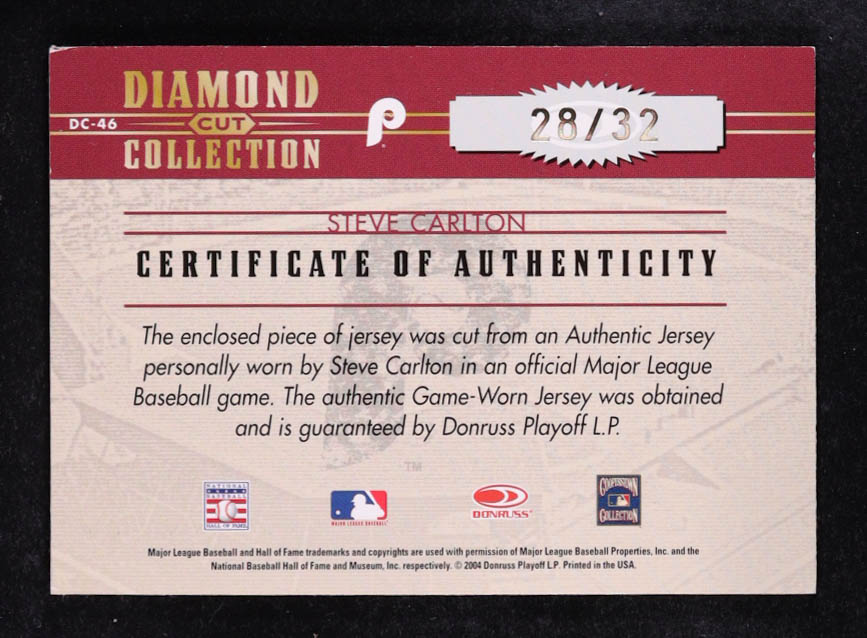 Steve Carlton 2004 Diamond Kings Diamond Cut Combos Signature #DC46 Jersey #28/32