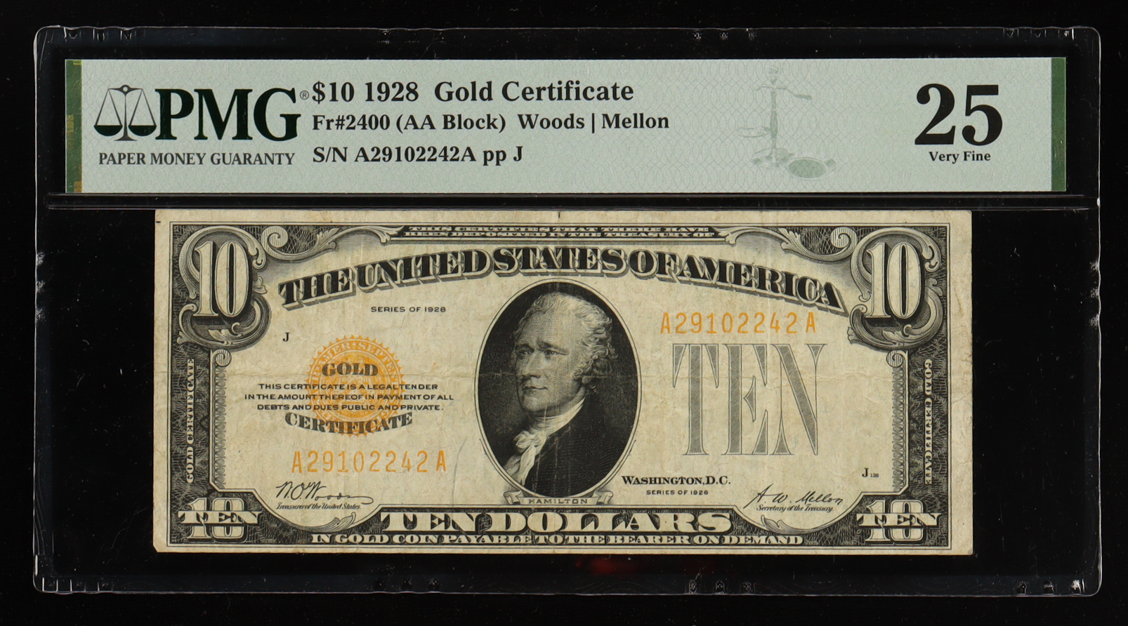 1928 $10 Dollar Gold Certificate AA Block (PMG 25 VF)