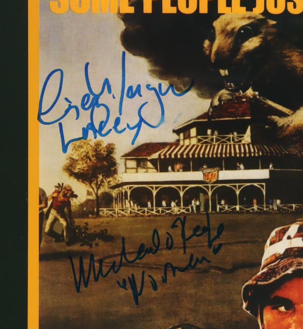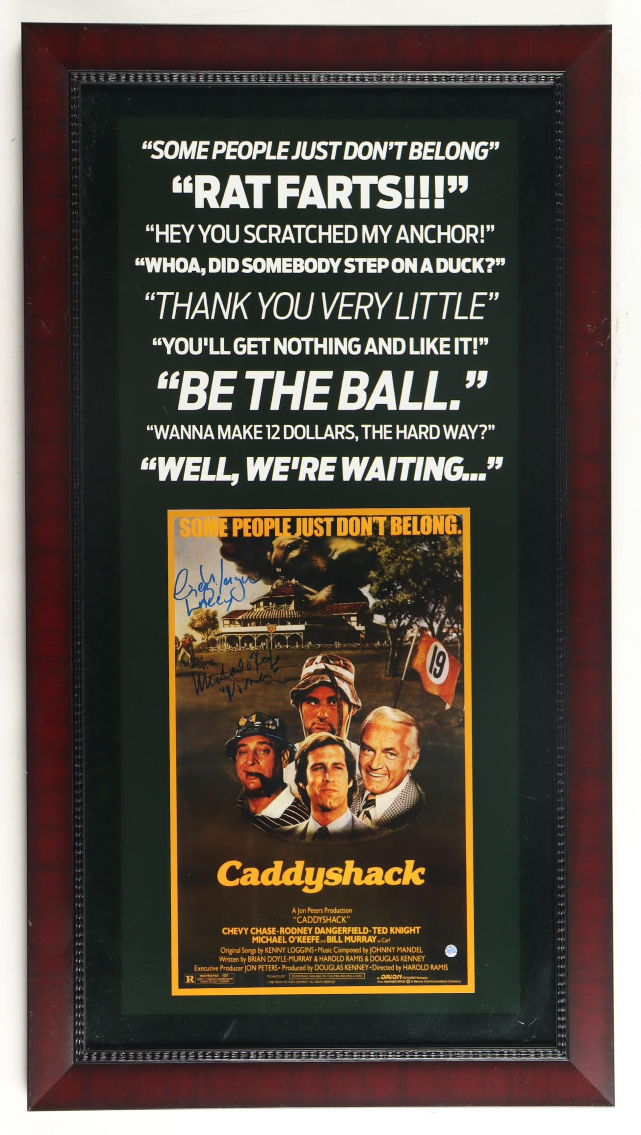 Custom frame measures approximately 19" x 35" in size and has been hand-signed and inscribed by Cindy Morgan (Lacey Underall) and Michael O'Keefe (Danny Noonan). Please see photos for details regarding the item.