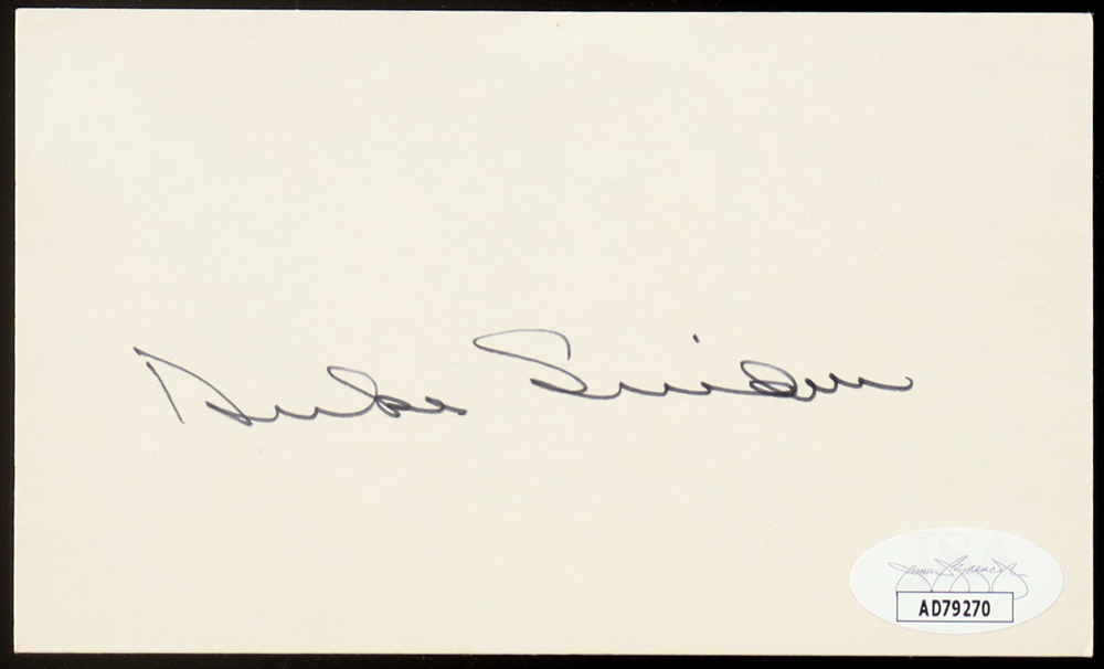 Index card measures 3" x 5" in size, has been hand-signed by Duke Snider (D. 2011, Brooklyn / Los Angeles Dodgers, HOF).