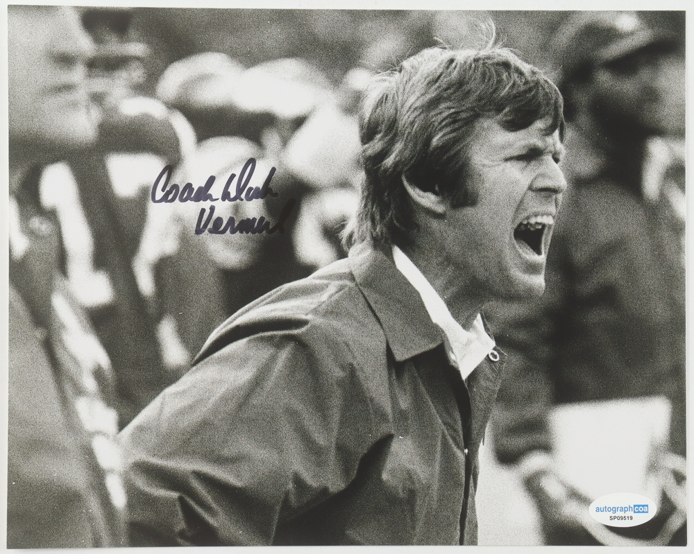 Photo measures 8" x 10" in size and has been hand-signed and inscribed by Dick Vermeil (Philadelphia Eagles, HOF).