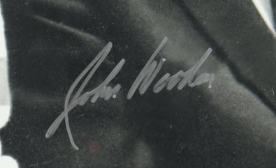 Custom frame measures approximately 22" x 26" in size and has been hand-signed and inscribed by John Wooden (D. 2010, HOF). Please see photos for details regarding the item.