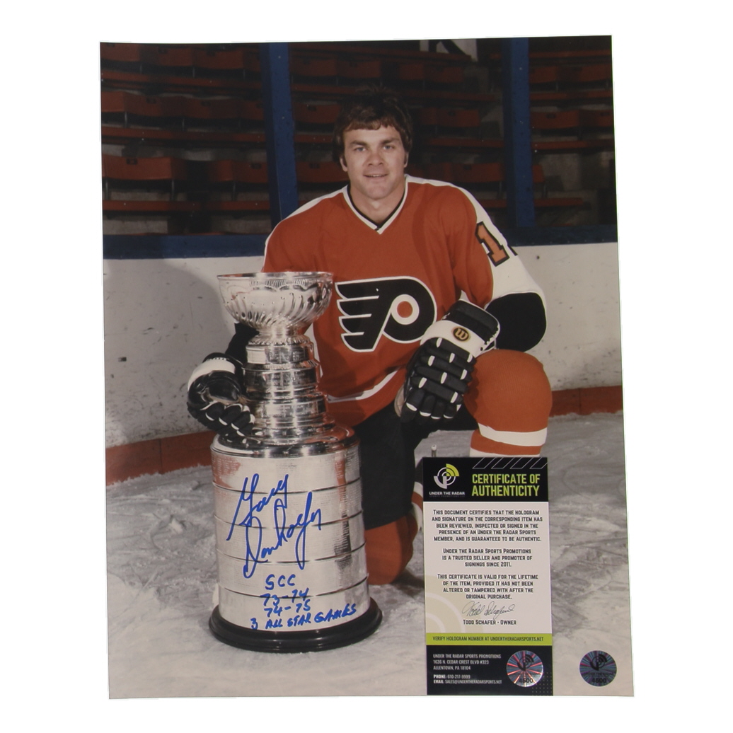 Photograph measures 11" x 14" and has been hand-signed by Gary Dornhoefer (Philadelphia Flyers).