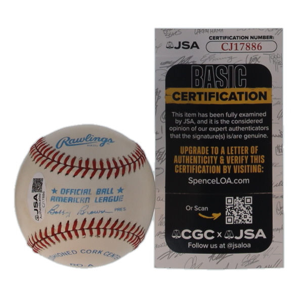 Rawlings Official American League Baseball. Hand-signed by Dennis Lamp (Chicago Cubs). Please note, the baseball is naturally toned.