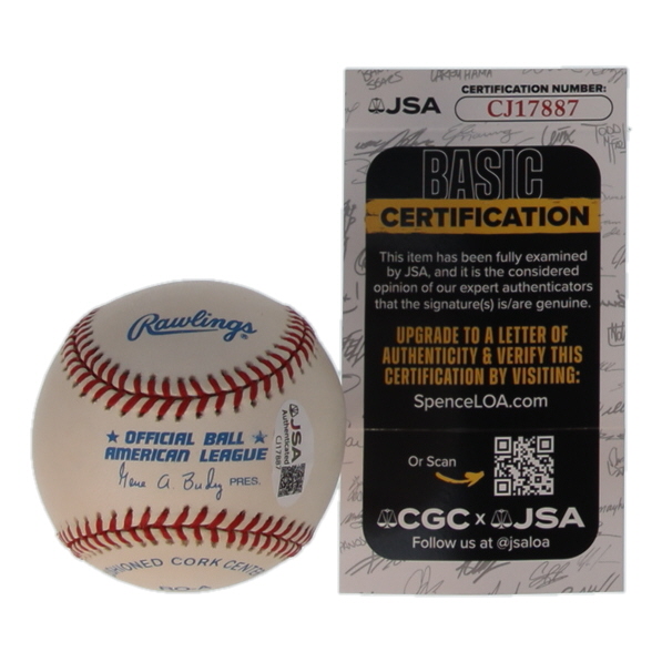 Rawlings Official American League Baseball. Hand-signed and inscribed by Russ Gibson (D. 2008, Boston Red Sox). Please note, the baseball is naturally toning and stained.